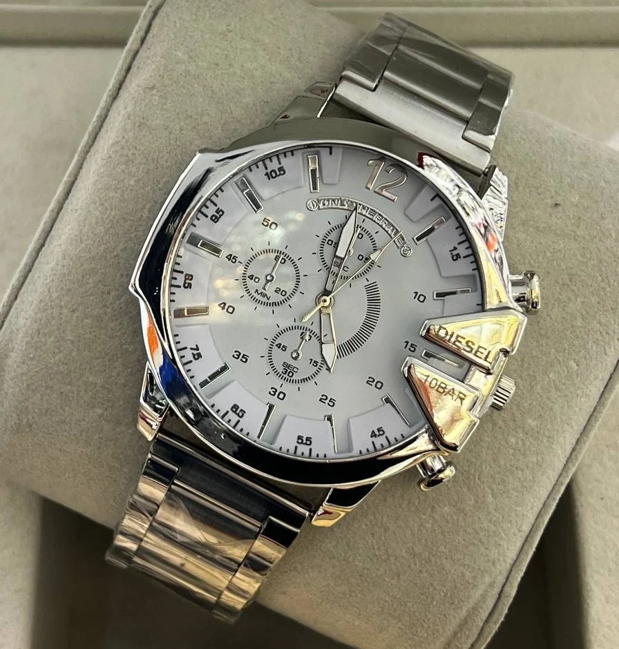 وقتی صحبت از ساعت‌های برند دیزل می‌شه، اولین چیزی که به ذهن میاد طراحی‌های خاص و متفاوتشه. دیزل همیشه ساعت‌هایی ساخته که استایل مردونه و جسورانه دارن. حالا اگه بخوای همون جذابیت شاخدار رو با یه رنگ ساده‌تر و کلاسیک‌تر تجربه کنی، مدل نقره‌ای با صفحه سفید بهترین انتخابه.