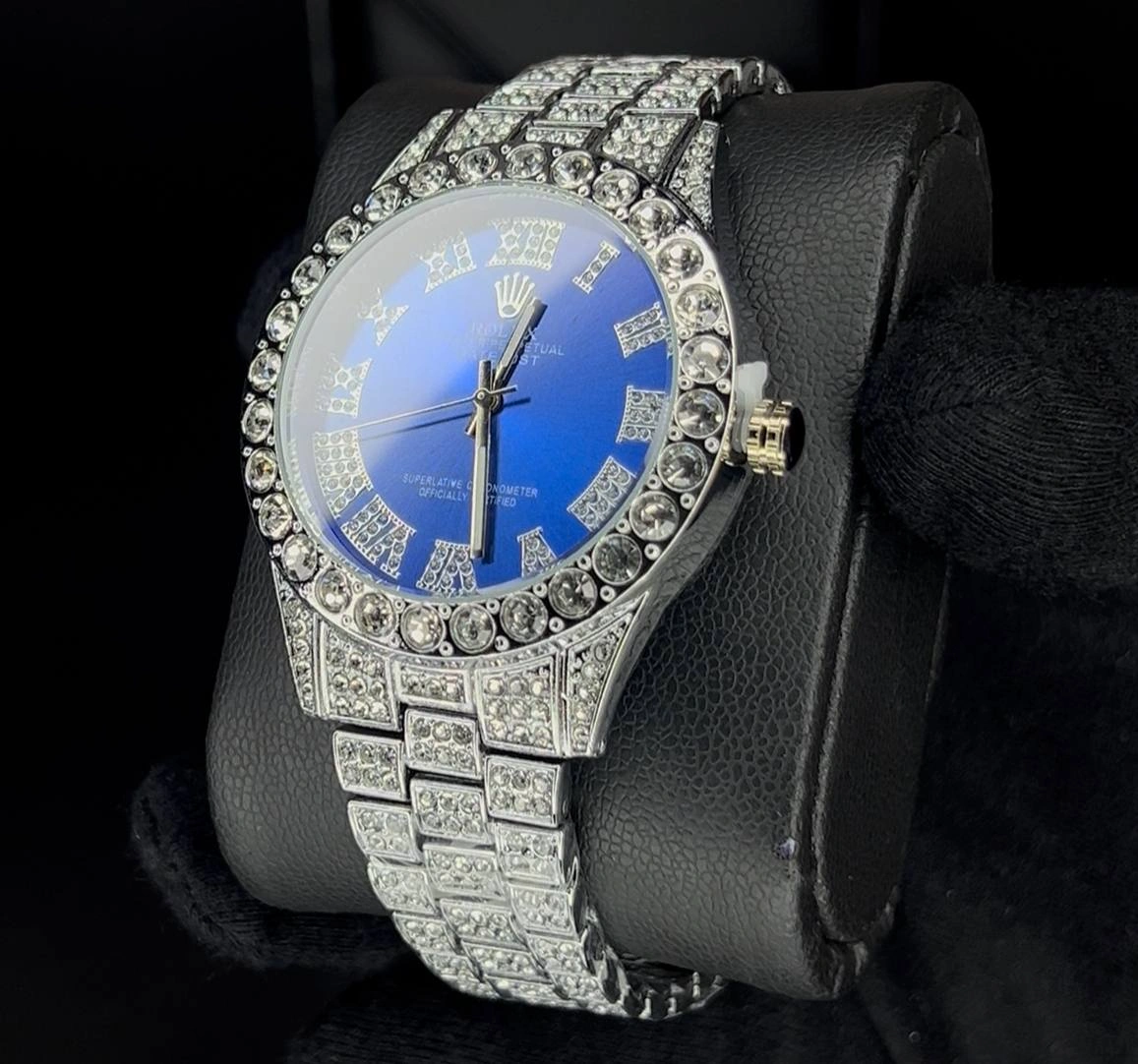 پیشنهاد ما: اگه دنبال یه ساعت مردونه شیک و خاص می‌گردی که هم برای استایل روزمره بخوره، هم برای مهمونی‌ها بدرخشه، این مدل فول نگین آبی–نقره‌ای بهترین گزینه برای توئه